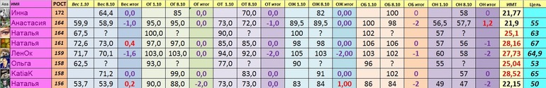 Привет! Вес 70.3, весы чудачат :) ог 95 ( неинформативна на гв, может обхват под грудью мерить? Типо спина?) ож 90, от 78 ( ого! Перемерла 10 раз), об 101, он 57. Тренировки три: две аэробика и одна аква с баней:)