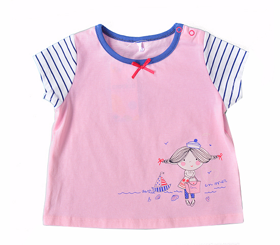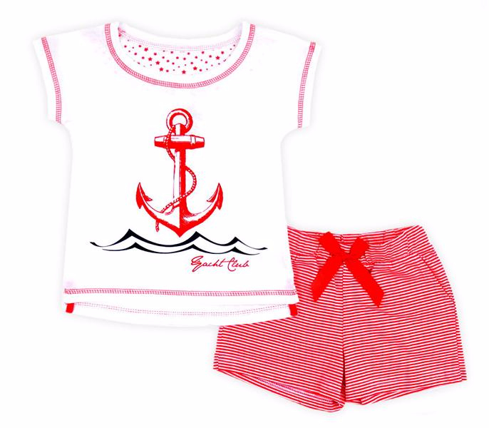 Восхитительный комплект, состоящий из футболочки и шортиков Вашей очаровашки. Белоснежная футболка с ярким принтом в виде якоря и полосатые шортики, окажутся как нельзя кстати во время Вашего летнего отдыха