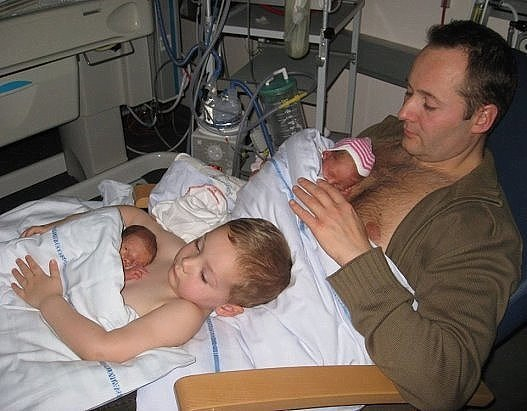 ЗдоровьеЭти близнецы родились недоношенными, их вес составлял всего 700 грамм. Пока мама находилась в тяжелом состоянии после кесарева сечения и не могла быть с малышами, старший братик и папа под руководством врачей принимали участие в выхаживании новорожденных с помощью метода «кенгуру».