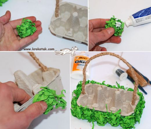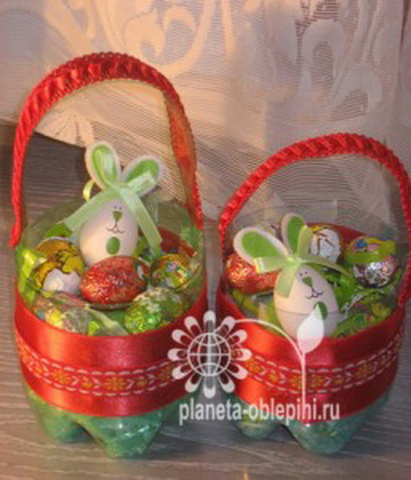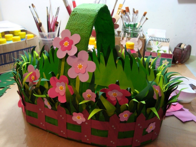 Можно изготовить из любых подручных материалов - упаковка из-под яиц, пластиковые бутылки, веток, пластмассовой тары, ткани, лент, картонных коробок и др.