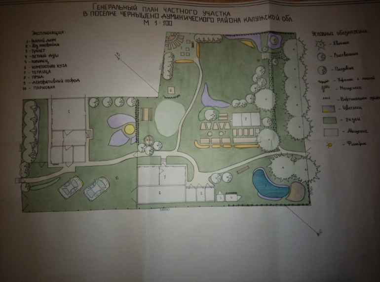 Это ген.план моего участка в уже спроектированном виде и отмытом в акварели