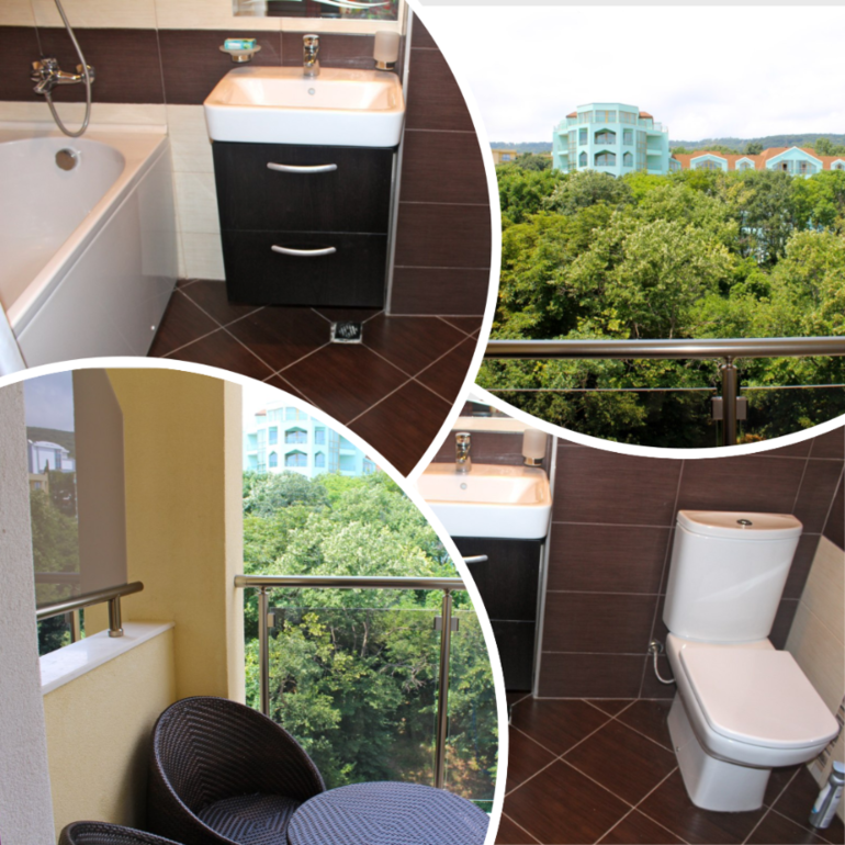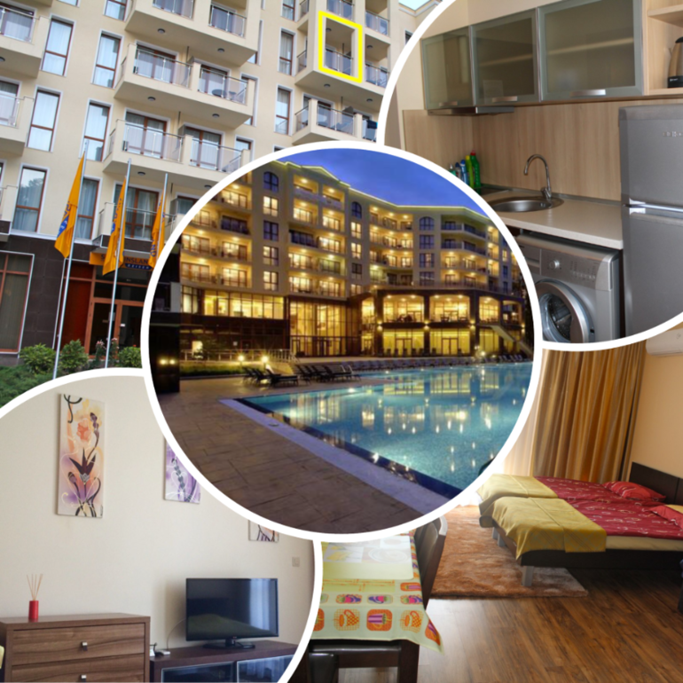 🚙 Как добраться до «Golden Line»: Проблем доехать до апарт-отеля не возникнет, так как ходят рейсовые автобусы, такси. Время в пути: 25 минут на такси и 35-40 минут на автобусе. Такси ориентировочно стоит 25 лева (12,5 евро). Апартотель 4*, построен в 2012 году.