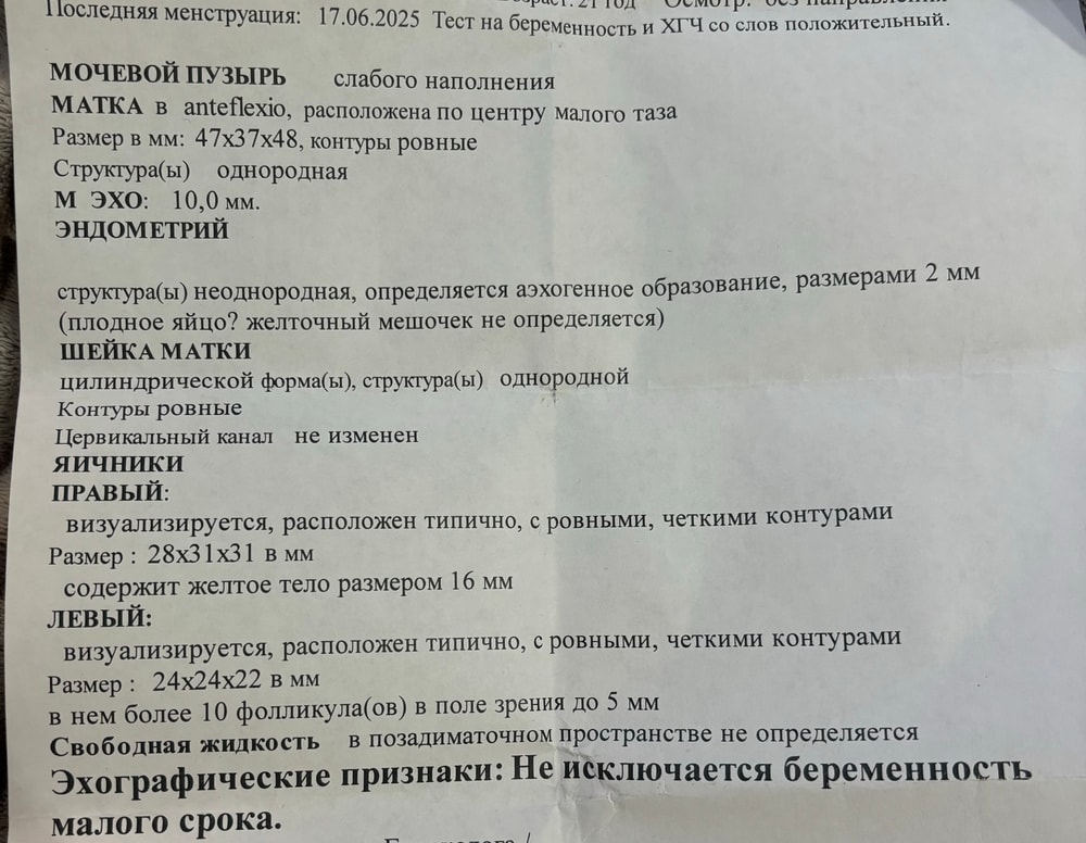 Медицинские вопросыВсем доброго дня! Второй день на измене ничего не понимаю. Постараюсь коротко и по делу. 17.06 была последняя менструация. 11.07 хгч был 264, 15.07 был 1526. 16.07 непонятные коричневатые выделения, испугалась и 17.07 пошла на УЗИ. Посмотрели трансвагинально на словах поняла, что плодное яйцо если это оно, еще не закрепилось в матке, но где именно оно тогда находилось я не поняла (приложу результаты узи, может есть те кто в теме, это была моя первая беременность я вообще ничего не понимаю🥲) после на кресле меня посмотрела гинеколог, взяла мазки и сказала что по мазкам нет конкретных примесей крови, ничего такого не назначила и отправила домой. Так же обнаружилась эрозия. Я приехала домой и через пару часов заметила, что у меня начала идти кровь, в перемешку с сгустками. Я поехала обратно, она меня посмотрела и выписала дюфастон по схеме каждые 8 часов. Сегодня утром 18.07 сдала срочный хгч он снизился до 1354, доктор сказал не пить больше таблетки и ждать. Я так понимаю, самый удачный исход- что все выйдет самостоятельно, самый не удачный- внематочная беременность. Как теперь эти два дня не сойти с ума я не знаю. Предполагаю, что удачного стечения обстоятельств где малыш смог зацепиться и остаться в самой матке - просто напросто нет. Теперь молюсь лишь бы не внематочная беременность. Посмотрите пожалуйста 🙏🏼 может кто разберется по узи все ли я правильно поняла??
