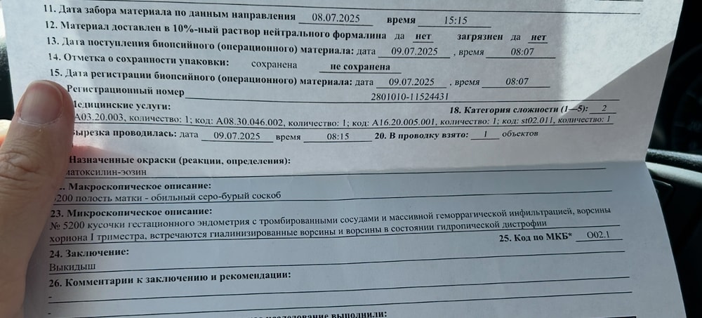 Медицинские вопросыДобрый день, к врачу только 12 августа, получила на руки гистологию после выкидыша , может кто-то подсказать, что это значит ? Прикрепляю фото. Спасибо!