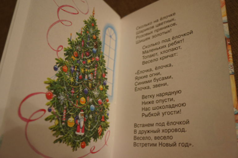 Когда я увидела картинки, то сразу влюбилась в эту книжечку. Формат книги небольшой, можно брать с собой хоть в поликлиннику, хоть в метро. Но не смотря на свои скромные размеры, это очень насыщенный сборник новогодних стихотворений и песенок - 39 произведений. Включает творчество С.Михалкова, А.Барто, А.Усачева, К. Чуковского, З.Александровой, М.Пляцковского и т.д.