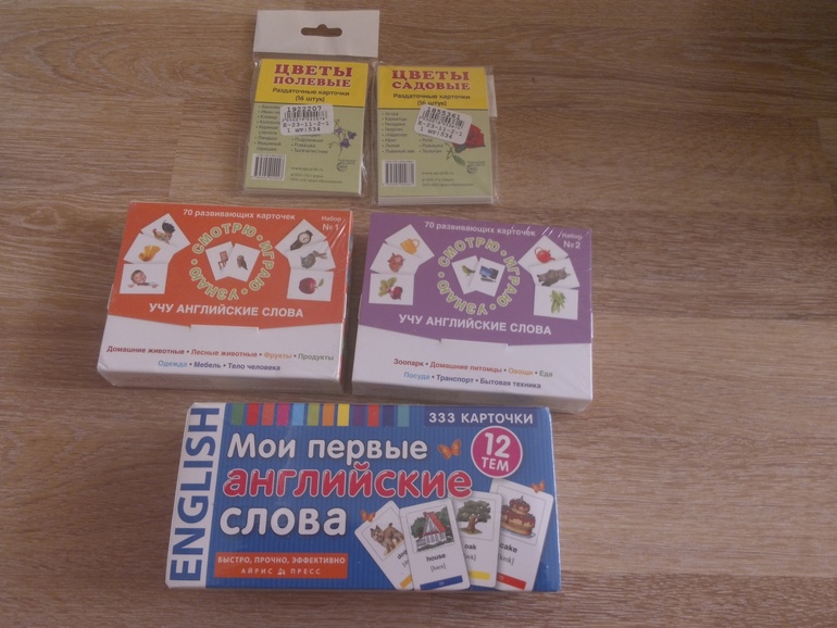 Не смогла написать текст в основном сообщении. Буду сама себя комментировать. Карточки. Из серии смотрю играю узнаю уже купила 4 комплекта, те что на русском. Смотрим каждый день по комплекту. 1 и 2 попроще. 3 4 посложнее в плане малышей, там слова поле, ветер, в общем мне тяжело малышу объяснить это понятие. И вот английские слова еще взяла на будущее и еще набор карточек. Не открывала, если кому надо, открою, сфотографирую. Вообще серия понравилась. Карточки плотные. Сама показываю, сыну не даю.:-) книгу заказала по отзывам, почитают, оценю. Тонкие книжечки мне понравились, можно брать с собой. и недорого.
