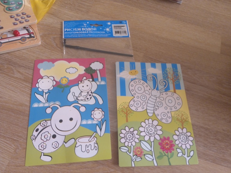 Стоит дешево и играть можно много. В наборе 2 картинки и кисточка. Покалякать в самый раз. сегодня пробовали. Сыну 1,2. Повозюкал кисточкой, вроде понравилось.