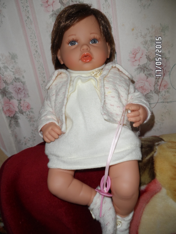 Кукла красивая))50см, ноги согнуты поэтому кажется более компактной. то уже вторая в нашей коллекции от Arias, тут руки-ноги полностью винил(очень мягкий и бархатистый) тело мягкое, без соски плачет. Руки-ноги сделаны так что вращаются полностью и кукла может сама сидеть и руки поднять.
