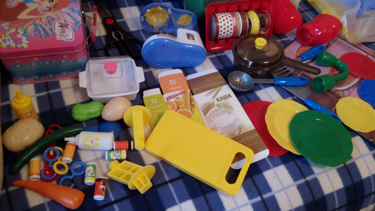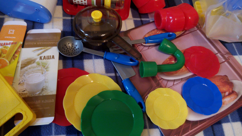 Сковорода, 3 большие тарелки,3маленькие тарелки, лопатки для приготовления, мерные лоечки, сушилка для тарелок, масленка, кофеварка,нож, разделочная доска. Есть овощи и яичко. Немного баночек.