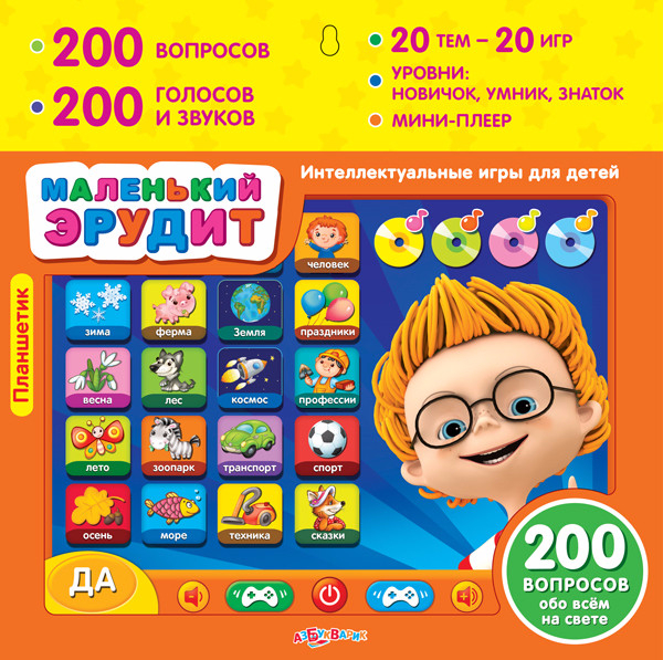 Ваш малыш любит умные игры-викторины? Тогда этот планшетик - для него! 200 вопросов, 20 разнообразных тем, 3 уровня сложности ждут маленького эрудита. А любознательный Макс поможет игроку стать Суперзнатоком! Бонус - мини-плеер с современными танцевальными мелодиями.