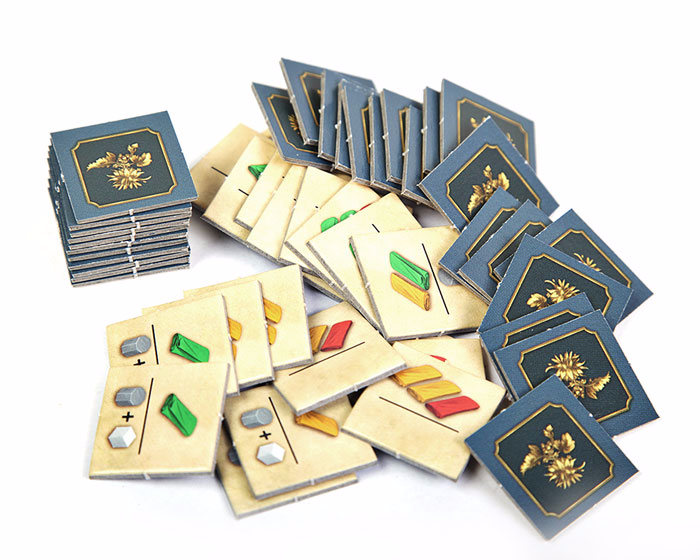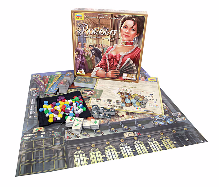 В наборе: игровое поле; 55 карточек; жетоны: 42 Платьев, 48 Материалов, 48 Очки престижа; деревянные фишки: 80 Собственности, 16 Пряжи, 16 Кружев; плашки игроков 5 шт.; мешок; инструкция.