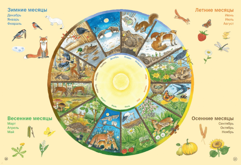 Тематические главы расскажут, как происходит смена времен года, какие растения и животные живут в лесу, кого из них можно увидеть ночью, а кого днем. Весной и летом рождаются малыши, и мы проследим, как они растут, учатся, меняются. В конце книги есть страницы с подсказками для родителей, как более интересно и результативно заниматься с ребенком.