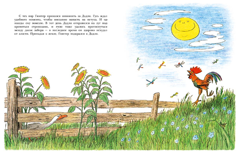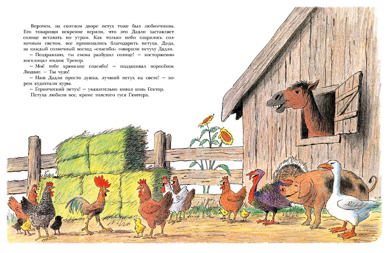 Каждое утро петух Дадли первым приветствовал солнце. В ответ солнце одаривало его широкой улыбкой - Дадли был его любимым кукарекой. Впрочем, на скотном дворе петух тоже был любимчиком. Животные искренне верили, что именно Дадли заставляет солнце вставать по утрам. Сам Дадли так не думал и, чтобы исправить это недоразумение, решил рассказать товарищам, что он самый обыкновенный петух и что его пение не будит солнце - оно всходит само по себе. Но злой, завистливый гусь Гюнтер подслушал его мысли и объявил Дадли мошенником. Обитатели скотного двора не поверили толстяку Гюнтеру. И оказались правы. Однажды Дадли не смог прокукарекать рассвет, и солнце не взошло.