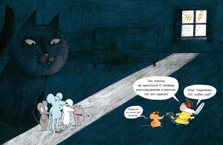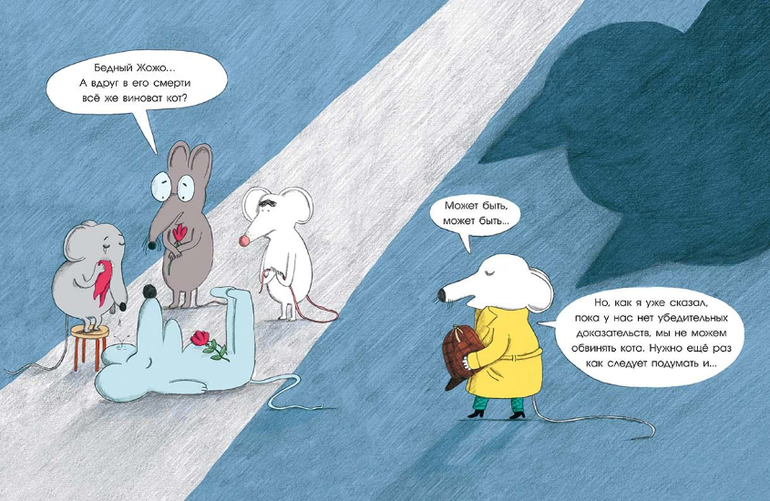 Однажды ненастной ночью случилось страшное: мышонок Жожо был убит. По крайней мере, так показалось, его друзьям, потому что Жожо лежал на полу и не двигался. Сначала все подозрения падают на кота, ведь коты, как известно, едят мышей. А еще на стене были обнаружены следы когтей, кто-то слышал ночью кошачье мяуканье и даже видел лохматую тень на стене. Казалось, бы всё очевидно: преступление совершил кот. Но сыщик Микки не торопится его обвинять. Он проводит тщательное расследование, собирает улики и опрашивает свидетелей. И не зря, потому что, как выяснилось, кот был тут ни при чём. А мышонок Жожо вовсе не умер - просто крепко уснул!