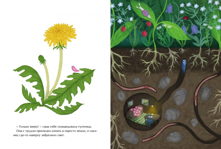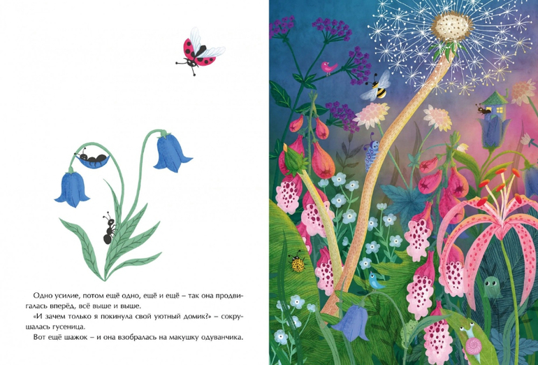 Эту необычную книжку придумала Мария Тролле - известный шведский иллюстратор и дизайнер. С особенной любовью она изображает растения и насекомых, за которыми любит наблюдать в собственном саду. Однажды она увидела, как по высокому стеблю медленно ползёт гусеница, упорно поднимаясь всё выше и выше, и сочинила эту добрую, трогательную сказку о том, как исполнилось самое заветное желание гусеницы - она превратилась в бабочку и, взлетев, увидела, как прекрасен мир вокруг.