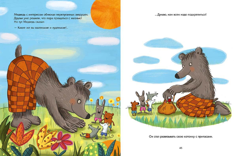В сказке «Осторожно, Медведь!» Мышонок и его друзья, придя однажды утром на любимую поляну, увидели на ней нечто незнакомое и странное. При ближайшем рассмотрении оказалось, что это медведь, который спал под деревом. Друзья с опаской оглядели лохматое чудище, его огромные лапы, толстый живот и мохнатую шерсть. Такое страшилище наверняка очень опасное и злое - подумали они. Они были уверены, что если медведь проснется, то наверняка их съест. Но только они собрались бежать, как медведь проснулся, сгрёб их всех в охапку и… прорычав «Как же я проголодался!» усадил рядом и угостил вкусным обедом. Отличный получился пикник, а Мышонок и его товарищи обрели нового друга.