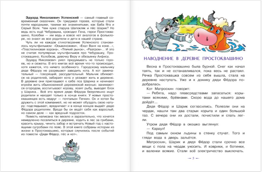 В повести Э. Успенского "Дядя Фёдор, пёс и кот" мальчик Фёдор, кот Матроскин и пёс Шарик познакомились и стали жить вместе в деревне Простоквашино. Благодаря рачительному Матроскину они научились вести хозяйство, нашли Шарику занятие по душе и помогли дяде Фёдору помириться с родителями. Но с ними произошло немало приключений, смешных и опасных историй. В этой книге - самые весёлые из них.