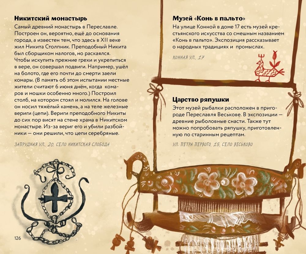 В наш путеводитель включены и другие старинные города неподалёку от основных и славные своими народными промыслами сёла, например Палех, - всего 18 точек маршрута. Для того чтобы посетить все эти места и подробно осмотреть их, понадобится не меньше месяца, но даже если у вас всего один день, вы найдёте в нашем путеводителе основные достопримечательности каждого и сможете организовать путешествие на свой вкус.