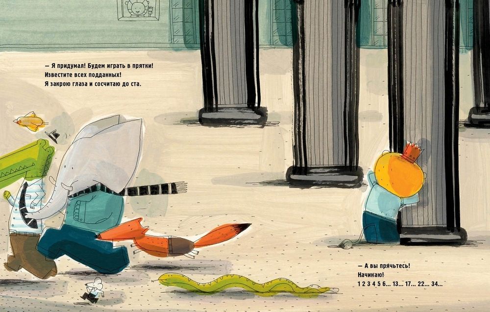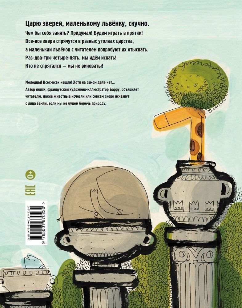 Царю зверей, маленькому львёнку, скучно. Чем бы себя занять? Придумал! Будем играть в прятки! Все-все звери спрячутся в разных уголках царства, а маленький львёнок с читателем попробуют их отыскать. Раз-два-три-четыре-пять, мы идём искать! Кто не спрятался - мы не виноваты! Молодцы! Всех-всех нашли! Хотя на самом деле нет...