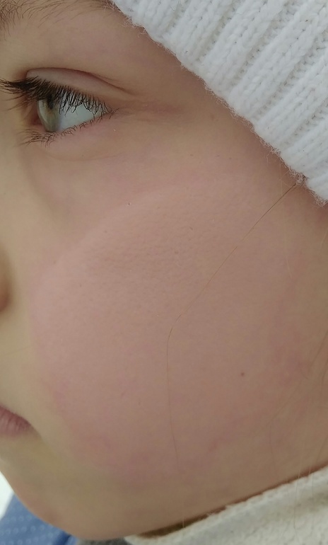 За почти 2 недели впервые после болезни вышли на улицу с дочкой 8 лет. -5, влажно, но не сказать, что прямо холодно. Через минут 15-20 обычно просто розовые на улице щёчки ребенка пошли белыми пятнами,а потом просто вздулись, побелели и вокруг розовый ободок.