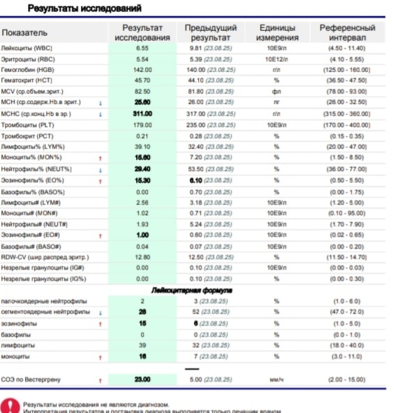 Елена в Здоровье детей от 6 лет 3 месяца Вирус? Анализы, исследования Помогите анализ понять, пожалуйста Посмотрите еще 20 записей на эту тему Отменить Ответить Ольга А симптомы какие? Эозинофилы повышены сильно. Лимфоциты и лейкоциты спокойны (бактерии и вирусы). Похоже на заражение гельминтами или простейшими. 09.09.2025 Ответить Елена Ольга, насморк, кашель, температура два дня была 09.09.2025 Ответить Ольга Елена, сдайте иммуноглобулин Е и кал/кровь на простейшие. Для аллергии конечно не характерны такие эозинофилы, но мало ли. 10.09.2025 Ответить Вопрос про Диаскинтест Ребенок совсем перестал расти Чаты Беременных Выберите чат: Январята-2026 Февралята-2026 Мартята-2026 Апрелята-2026 Майчата-2026 Июнята-2026 Июлята-2026 Августята-2026