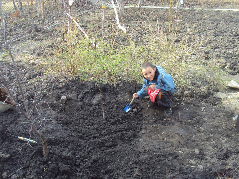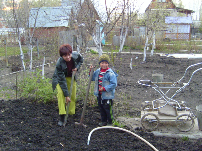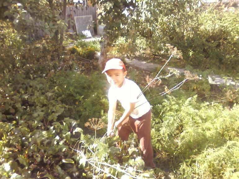 Во нашла древнее фото, в саду, приехали помогать деду что то строить. Даже не помню сколько нам здесь. Помогает деду что-то пилить, да и маме капать. Правда заплаканный- не давали пилить (боялись что руки отпилит себе). Но добился все таки, я же помощник-кричал!