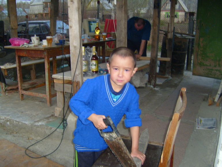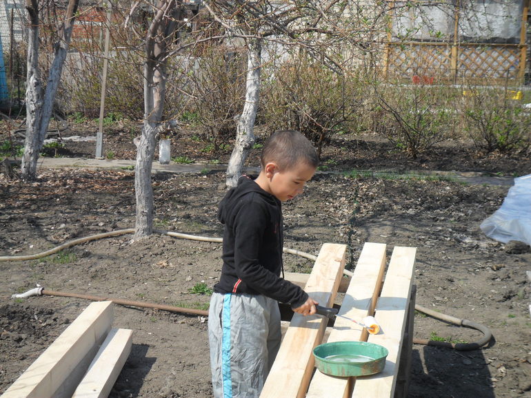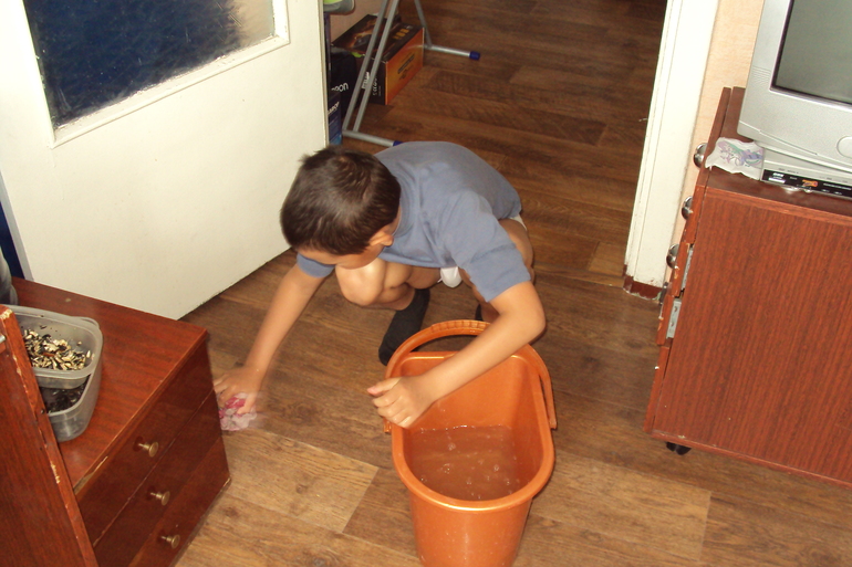 Приучала его с раннего возраста, если пролил чай, компот, да не важно что-возьми тряпку и вытри за собой. Стирка! О, стирку мы в детстве любили! Сейчас конечно не очень, ну зачем себя утруждать есть же стиральная машина! А когда был маленький, запачкался, бери и стирай, мама не железная! Конечно давала вещи типа носков и платков стирать, но что бы знал, что к вещам тоже надо бережно относиться. Полы мы тоже мыли. Да и сейчас моет, если я не успеваю, попрошу сделает. Умеет даже унитаз чистить. А самое главное, первый помощник у папы в саду, гвоздь забить, отпилить что-нибудь это Денис. И сажать помогает.
