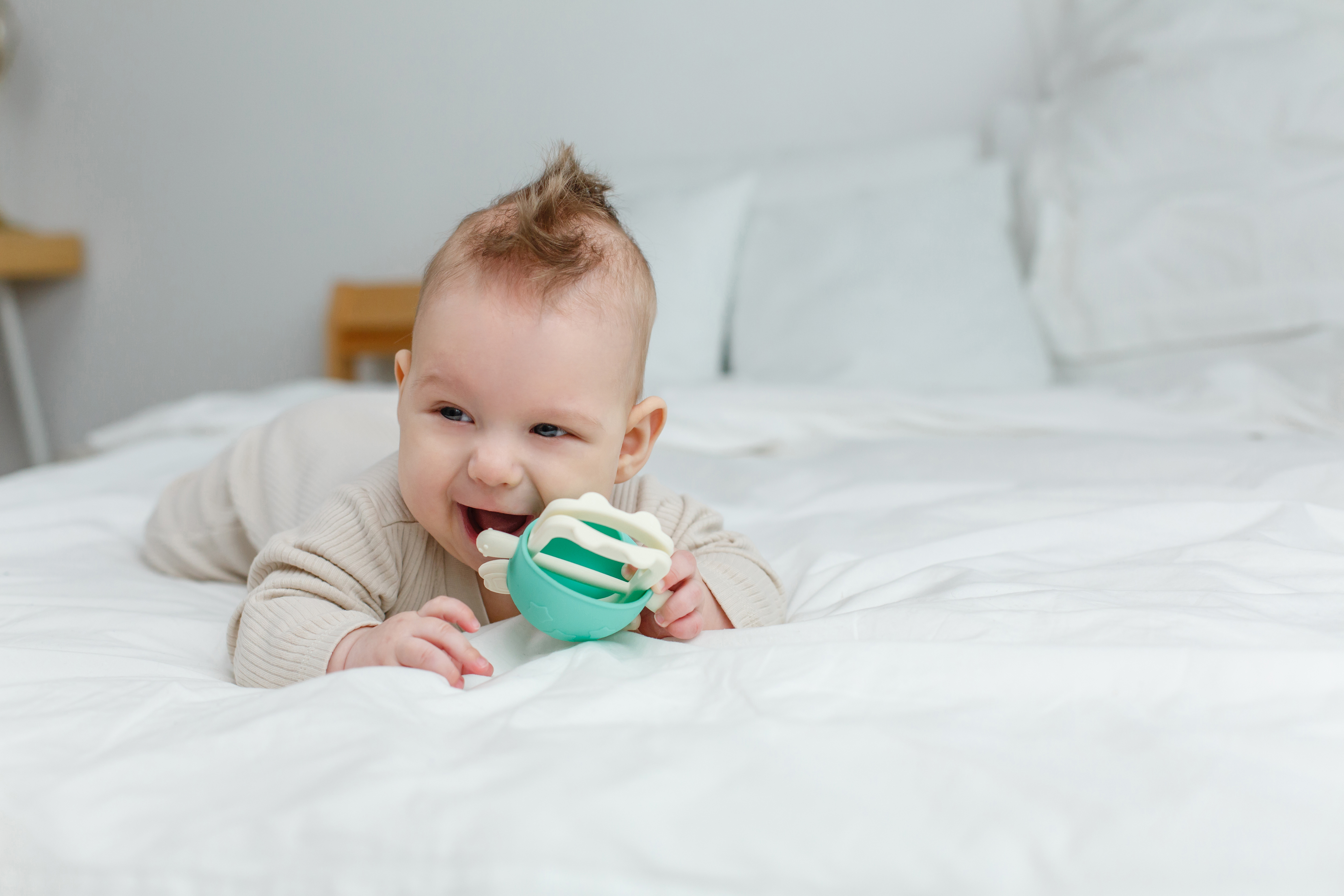 Игрушка, которую можно смело пробовать «на зуб» — кусать и грызть, чтобы уменьшить зуд и бережно массировать дёсенки в период прорезывания зубов. Ручка удобна для захвата, материал изготовления — безопасный «бархатистый» на ощупь силикон. Выступающие рельефные элементы привлекают внимание и занимают малыша, отвлекая от дискомфорта во рту, связанного с появлением первых зубов.