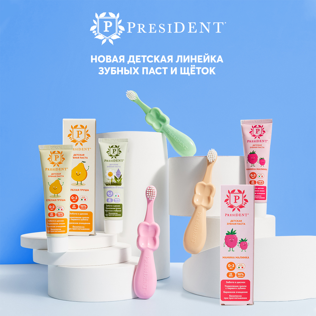 Родители, выбирайте детскую зубную пасту с реминерализующим компонентом в составе. Например, в детских зубных пастах PRESIDENT содержится лактат кальция – он защищает от кариеса и способствует укреплению эмали.