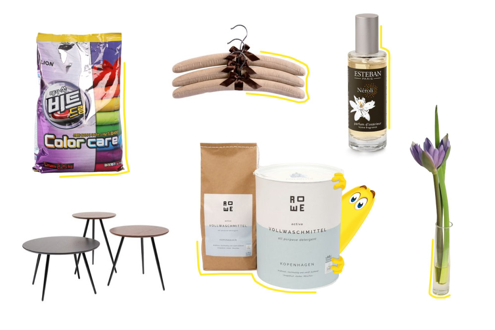 Гипоаллергенный концентрированный порошок для стирки Rowe, набор вешалок 3 шт 21maison, интерьерные духи-спрей Нероли Classic 30мл Esteban, порошок для цветного белья Lion, декоративный цветок в вазе Pauline H, столик кофейный Buzzola 60 см Bergenson Bjorn.