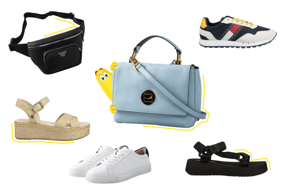 Сумка (сетчел) Coccinelle, сумка на пояс с монограммой бренда EMPORIO ARMANI, комбинированные кроссовки Tommy Hilfiger, босоножки на танкетке Tommy Hilfiger, кожаные кеды Ever be, сандалии с текстильными ремешками Calvin Klein.