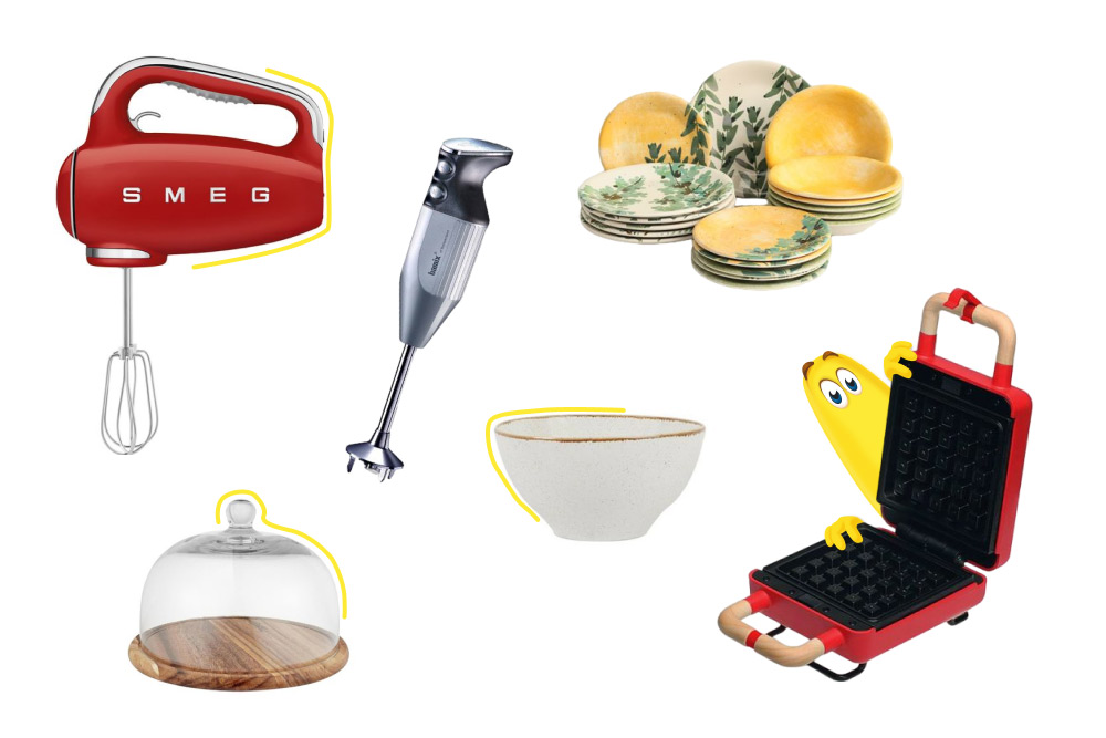 Миксер ручной Smeg, сервиз столовый из 18 предметов natural Excel COINCASA, доска разделочная с куполом 21maison, блендер Bamix, вафельница и сэндвичница 2в1 ADE.