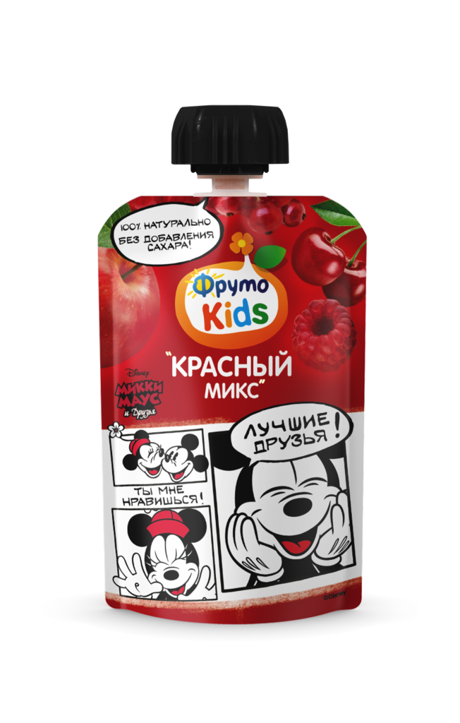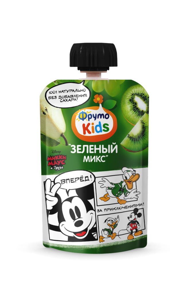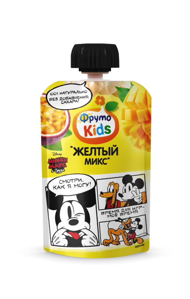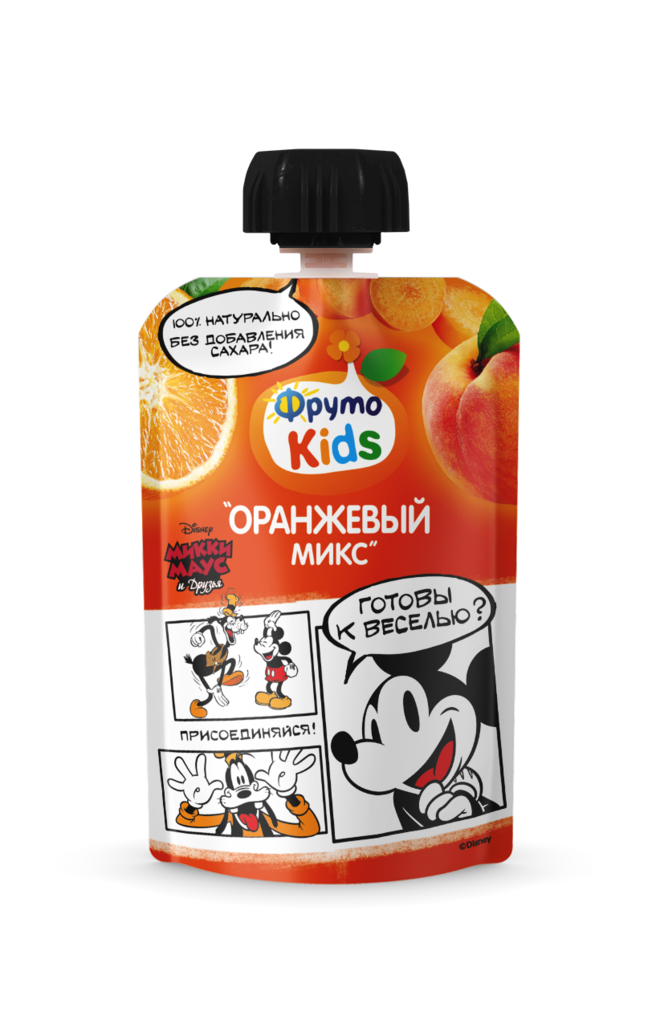 Любимый многими Микки Маус никогда не сидит на месте и очень любит путешествовать. С ним всегда его верные спутники, которые выручат в любой ситуации: Минни Маус, Плуто, Гуфи и Дональд Дак. Прямо как пюре «ФрутоKids» в удобной пауч-упаковке, которое всегда можно взять с собой, чтобы быстро подкрепиться в любое время и отправиться дальше к новым победам.