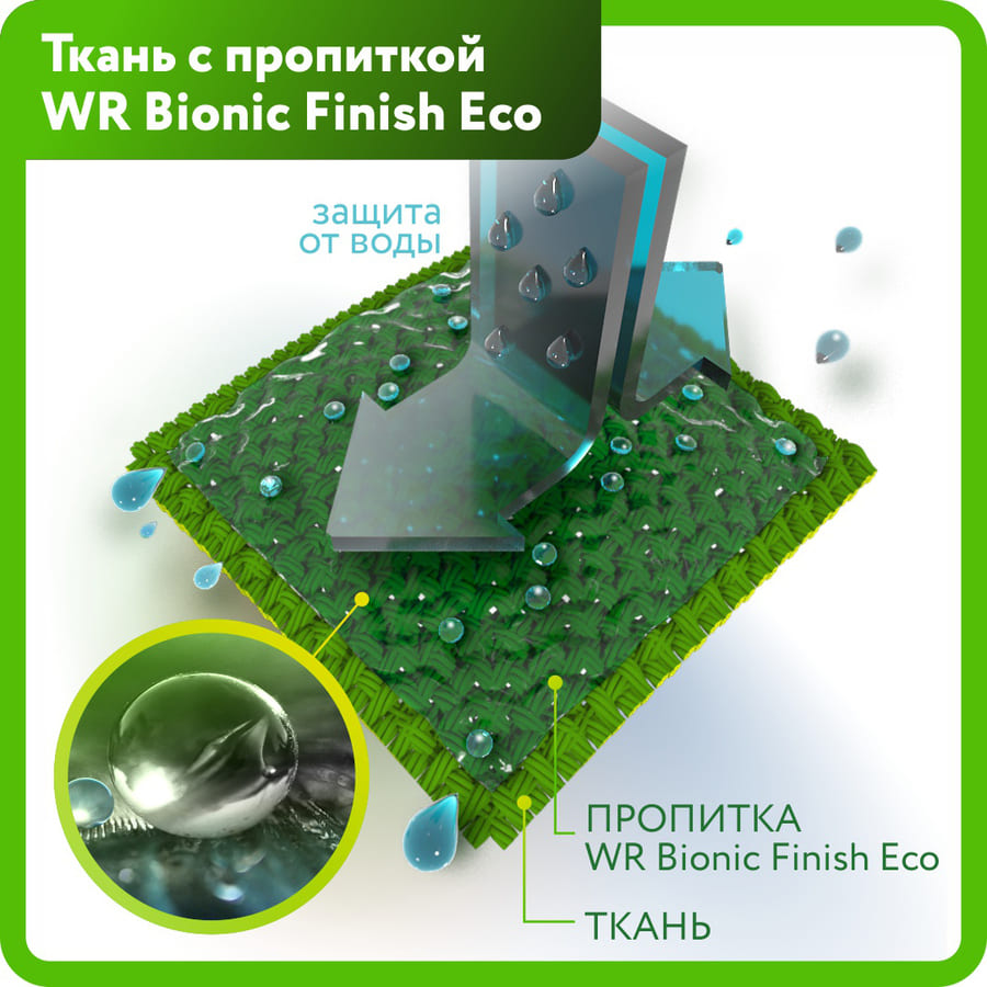 Следующий шаг – использование нефторированных эко-пропиток ткани WR Bionic Finish ECO и Teflon EcoElite. По своим характеристикам они не уступают традиционным водо-грязеооталкивающим пропиткам и покрытиям, но не содержат в составе токсичного фтора, который вымывается при стирке вещей. Больше того покрытие Teflon EcoElite создается на 60% из органического, природного возобновляемого сырья.