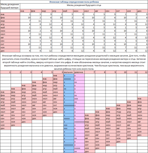 - На второй определите половую принадлежность. В верхнем горизонтальном ряду находите свое число, а столбец слева разбит по месяцам — это время зачатия . В ячейке на пересечении числа и месяца оплодотворения вы увидите пол будущего ребенка.