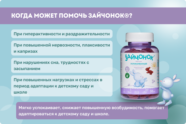 Зачастую проблему беспокойства ребёнка можно решить доступными средствами. В этом может помочь уникальная линейка вкусных, натуральных, успокаивающих и укрепляющих иммунитет продуктов для детей Зайчонок®. Вкусные успокаивающие жевательные пастилки Зайчонок® на основе 100% натуральных соков для гиперактивных и раздражительных детей с 3 лет. В составе: