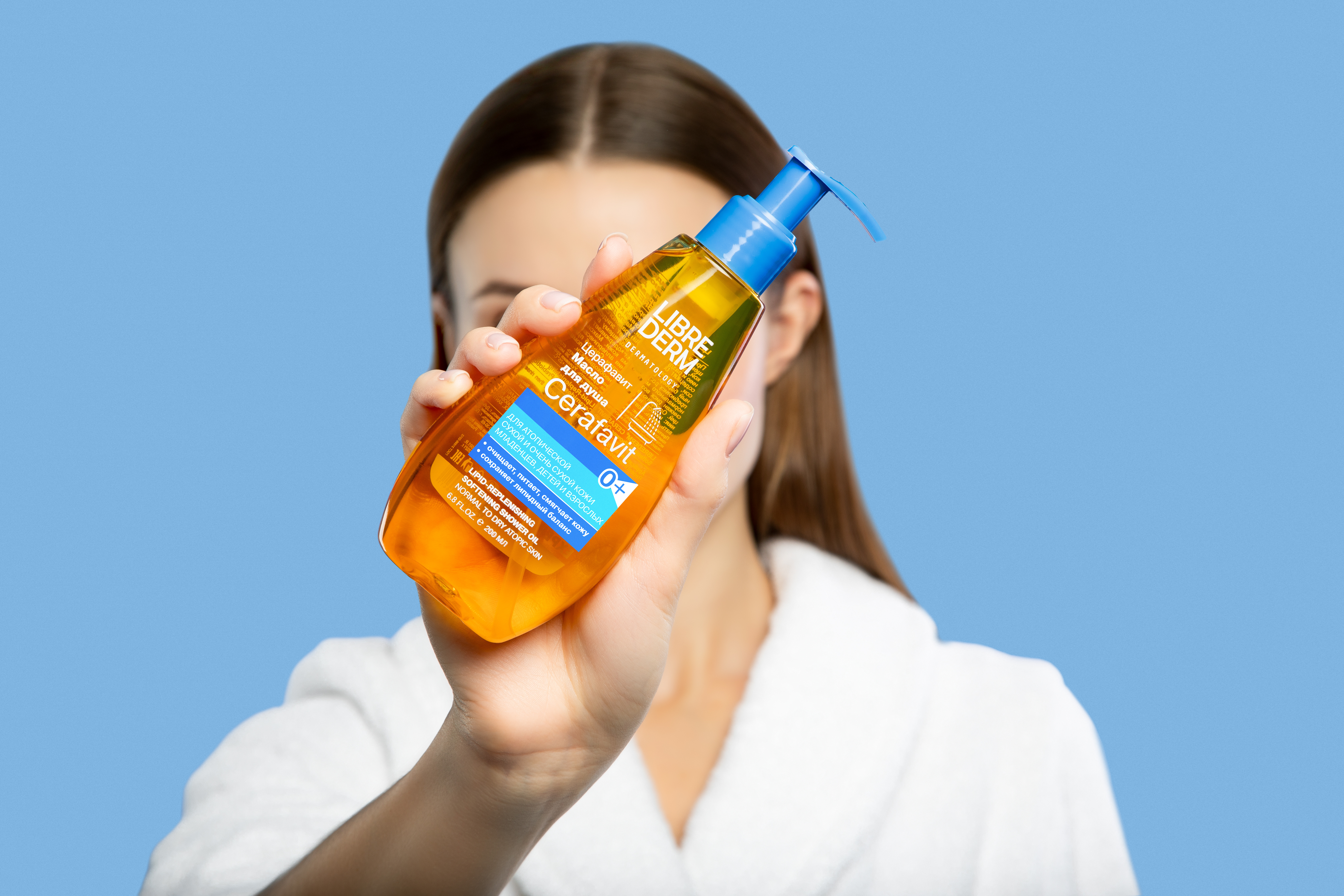 И, пожалуй, самое важное. Особое внимание нужно уделить правильному выбору очищающего средства с мягким составом. Обычное высокощелочное мыло не подходит атопической коже, может усугублять сухость и другие неприятные симптомы. Также стоит категорически исключить купание в травах – это, напротив, может спровоцировать заболевание. Для деликатного очищения и одновременного смягчения кожи детей, а также взрослых с атопией дерматологи рекомендуют использование аптечных липидовосстанавливающих косметических средств, которые прошли необходимые исследования, например, смягчающее масло для душа с церамидами и пребиотиком линейки Cerafavit от бренда LIBREDERM. Бренд имеет безупречную репутацию дерматологического производителя косметики. Масло Cerafavit содержит более 50% натурального масла сои, которое восстанавливает липиды кожи, а также эпидермальный барьер и влагоудерживающую способность. Масло сделано на безводной основе за счёт чего более качественно увлажняет кожу, уменьшает сухость и чувство дискомфорта с первого применения. Использование масла – это первый этап очищения кожи, второй этап – полноценное увлажнение, питание и восстановление сухой, чувствительной и атопической кожи. Об этом рассказываем далее.