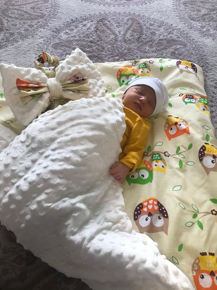, брала в качестве конверта-пледик с бантиком, с утеплителем, его убрала, пледом пользуемся и сейчас