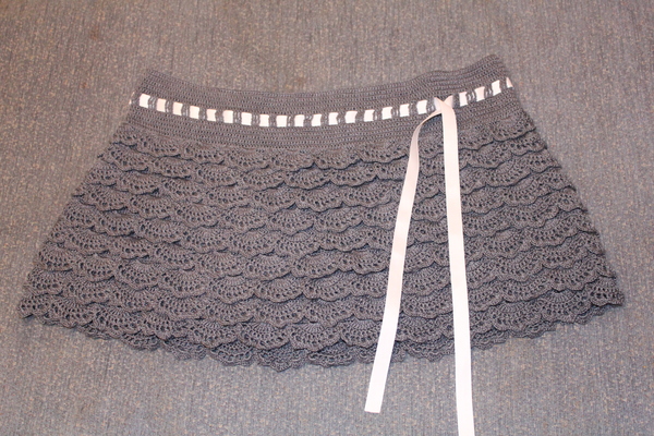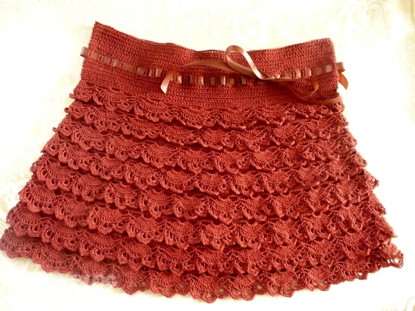 в общем, я связала нужную длину юбки,а потом собиралась навязывать на них рюши,а как померила-расстроилась,потому что юбка оказалась такой облегающей мне,прибавляла я 1 раз всего,поэтому получилась прямая,и я распустила и щас начала заново((