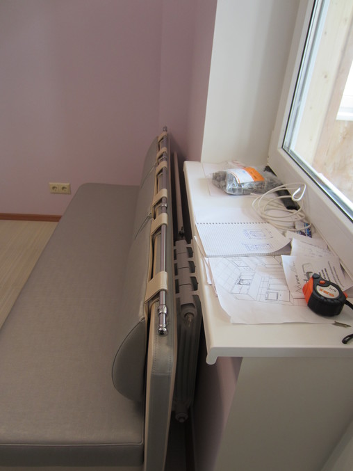 Я за первый вариант. А прораб мог бы предложить и батарею зашить в короб с пластиковым экраном. Тогда и подоконник сделали бы шире. Все было бы на одном уровне))) А во втором варианте сбоку может встать стул, если стол будет короче дивана.