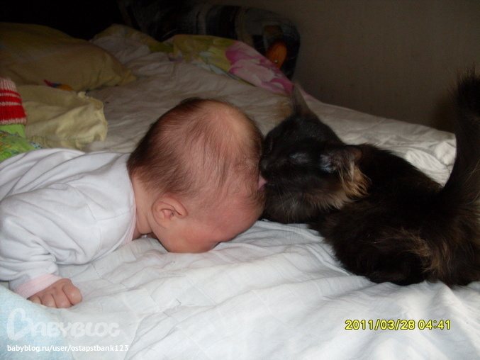 И у нас кот) во время б родители каждый раз говорили, что от кота надо избавляться. Пугали токсоплазмозом,алергией у ребенка.Я все время огрызалась, что никуда его не дену. Раз я взяла на себя ответственность за него, должна ухаживать. Да и люблю я его, не могу никому отдать! Как-никак 4 года с нами живет. Ничего страшного не вижу в том,что в доме животные вместе с ребенком. Не может быть в квартире стерильно, да и никчему это!и животные тут непричем. Правда, мы пока не разрешаем коту с ребенком лежать, но они уже общаются) трогает его, смеется) хотя кот не особо в восторге, опасается) нюхает только. А вообще он спокойный, ласковый и терпеливый, ребенка не обидит.один раз даже массажистку укусил за ногу, защищал дочку))