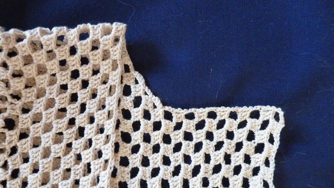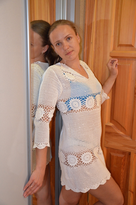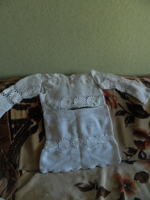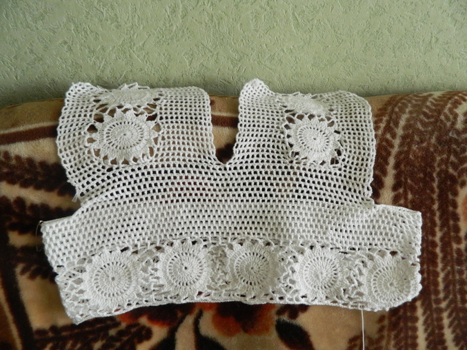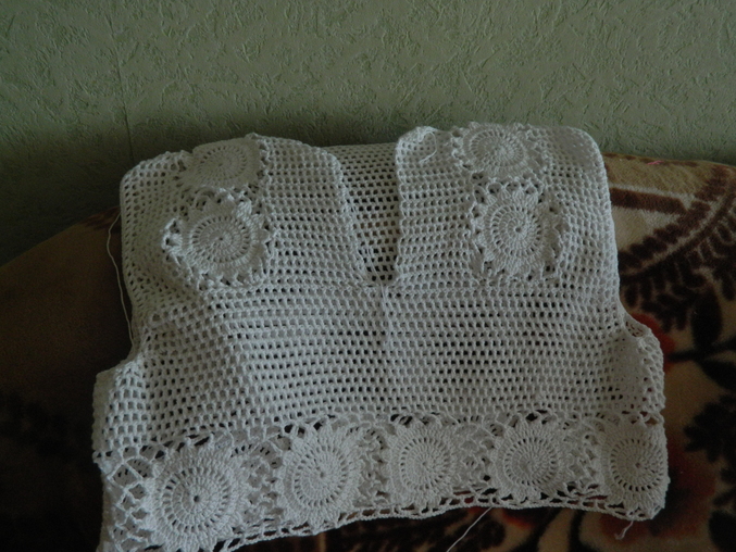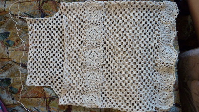 на настояящий момент есть вот что. снчала вязала полоску кружочков, потом сеточкой по кругу снизу вверх, привязала еще одну полоску кружочков и дальше до проймы по кругу сеточкой. сейчас вывязываю проймы для спинки.
