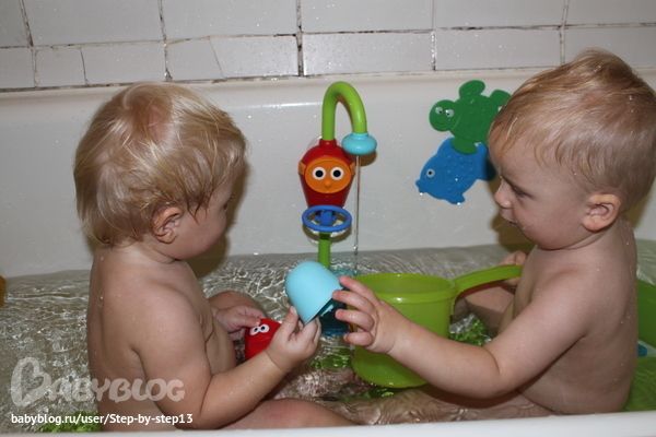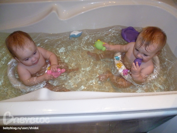 с 7 месяцев у нас 2 резиновых коврика ( чтоб целиком закрывать днище ванны).Передвигаемся туда сюда, купаемся только вместе, так как им играть очень хочется друг с другом и с водой)