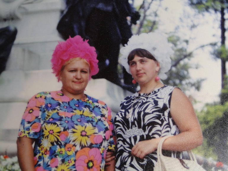 спасибо))) украшения - моя слабостьеще, кстати, из интересненького есть женские солнцезащитные очки 50х гг из Штатов, но сфотографировать не могу, не в этой квартиренедавно свекровь подарила ткань из каких-то залежей давнишних, привезена была тоже из Штатов в конце 60х, но что из нее сшить, - ума не приложу пока; она серого цвета, качество хорошее, но в моем представлении только на мужские брюки или на пальто легкое, летнее... а еще...))) подарила она мне такую смешную... ээээ, как бы это назвать, шапочку... я даже не в курсе была, что такое носили; вот фото того времени, где она в ней (справа, белая)... это 64г... понятно, что сейчас она не такая белоснежная... пока не выходила в ней в свет)))))