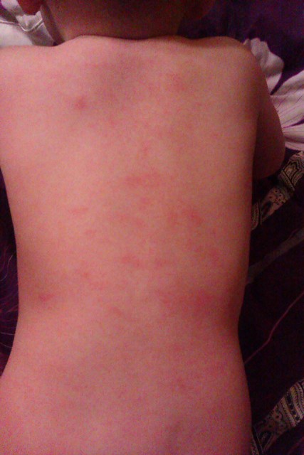 Девочки,посмотрите.Кач-во фото не очень конечно, но я блин больше не могу! сын весь в сыпи, по всему телу,на щеках,на ножках в районе икр сухая кожа, отшелушенная немного и такие же пятга,при чём они одинаковые!!!!! фенистил не помогает((( на что это похоже? помогите