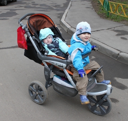 между детьми 2 года разницы. Спец. коляску для двойни не покупала, сажала сына на люльку на дощечку. Не очень удобно. Правда, было это всего несколько раз: с двумя детьми в одиночку по магазинам и врачам не ходила....