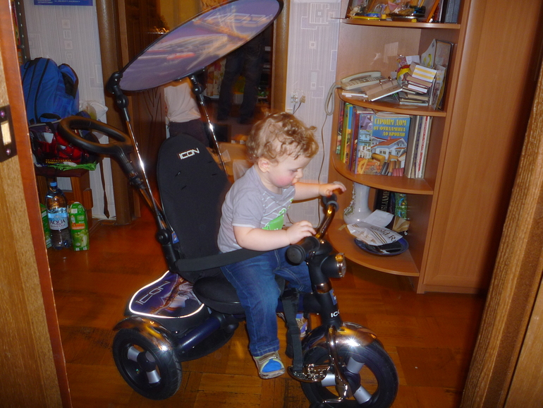 вот он такой мягкий,колеса не гремят,сиденье удобное,подножки можно переставлять как тебе надо,а потом все скидываешь и маленький велосипед сами гонять будут..за 3000 , мы за 4300 взяли