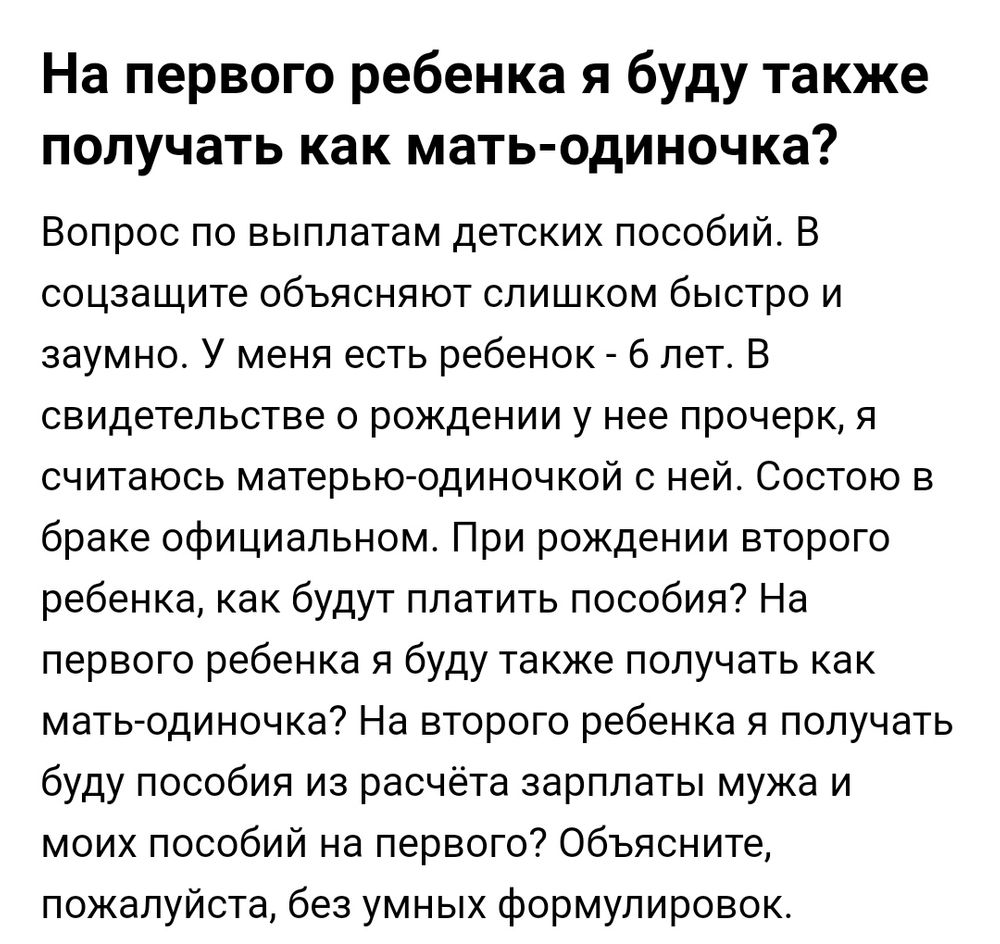 Ольга Лебедь, а если я со вторым буду в декрете, с работы получать буду по уходу, кае для первого ребенка тогда мои доходы будут считать? И для второго также, мои доходы будут делить на двоих детей, а доходы мужа только на одного? Если я захочу на второго оформить как малоимущие, доходы мужа и что еще будут считать? Я немного запуталась
