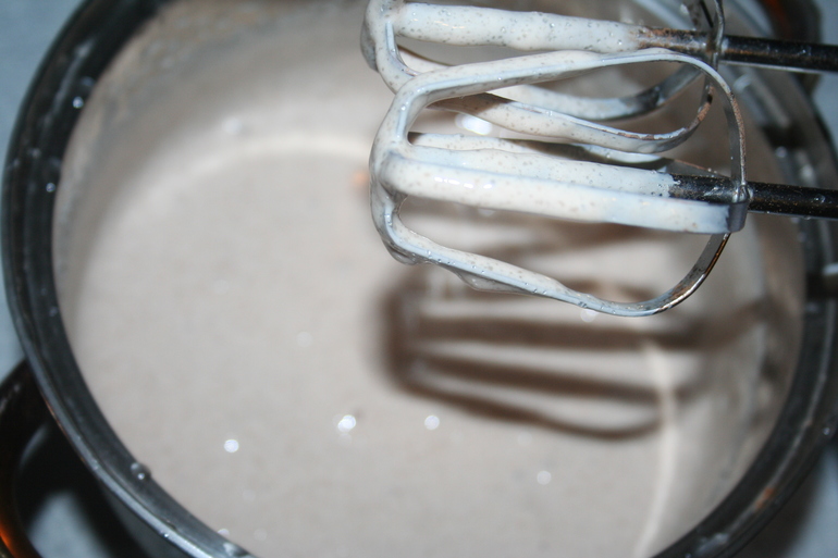 Тесто готовится очень быстро. Растапливаем в кастрюльке маргарин и добавляем к нему кефир, сахар и соду, хорошенько перемешиваем миксером и добавляем яйца, опять смешиваем и засыпаем какао и муку. Смешав все ингредиенты получаем жидкое тесто, которое заливаем в формочку смазанную сливочным маслом. У меня форма диаметром около 20 см.