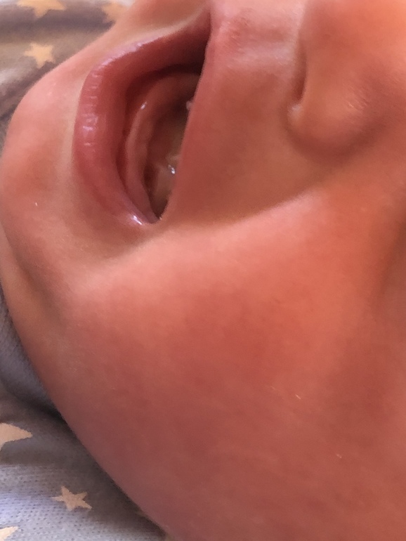 Десна подпухла, слюни, нашёл уже свой кулак и жуёт (как может конечно, больше трёт)